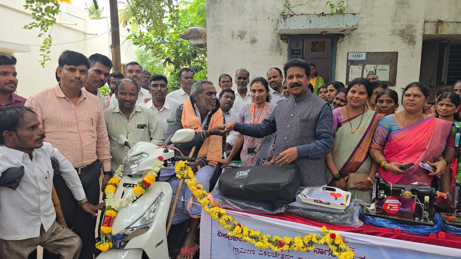 ಚಳ್ಳಕೆರೆ ನಗರದ ತಾಲ್ಲೂಕು ಪಂಚಾಯತ್ ಆವರಣದಲ್ಲಿ ನಡೆದ ವಿಕಲಚೇತನರು ಮತ್ತು ಹಿರಿಯರ ನಾಗರಿಕ ಸಬಲೀಕರಣ ಇಲಾಖೆ ಚಿತ್ರದುರ್ಗ 2024 -25 ನೇ ಸಾಲಿನ ಗ್ರಾಮೀಣ ವಿಕಲಚೇತನರ ಪುನರ್ವಸತಿ ಯೋಜನೆ, ಇಲಾಖೆಯ ವಿವಿಧ ಸೌಲಭ್ಯಗಳ ಫಲಾನುಭವಿಗಳಿಗೆ ಸ್ಕೂಟಿ ಇತರೆ ಸೌಲಭ್ಯಗಳನ್ನು ವಿತರಣೆ ಮಾಡಿದರು .