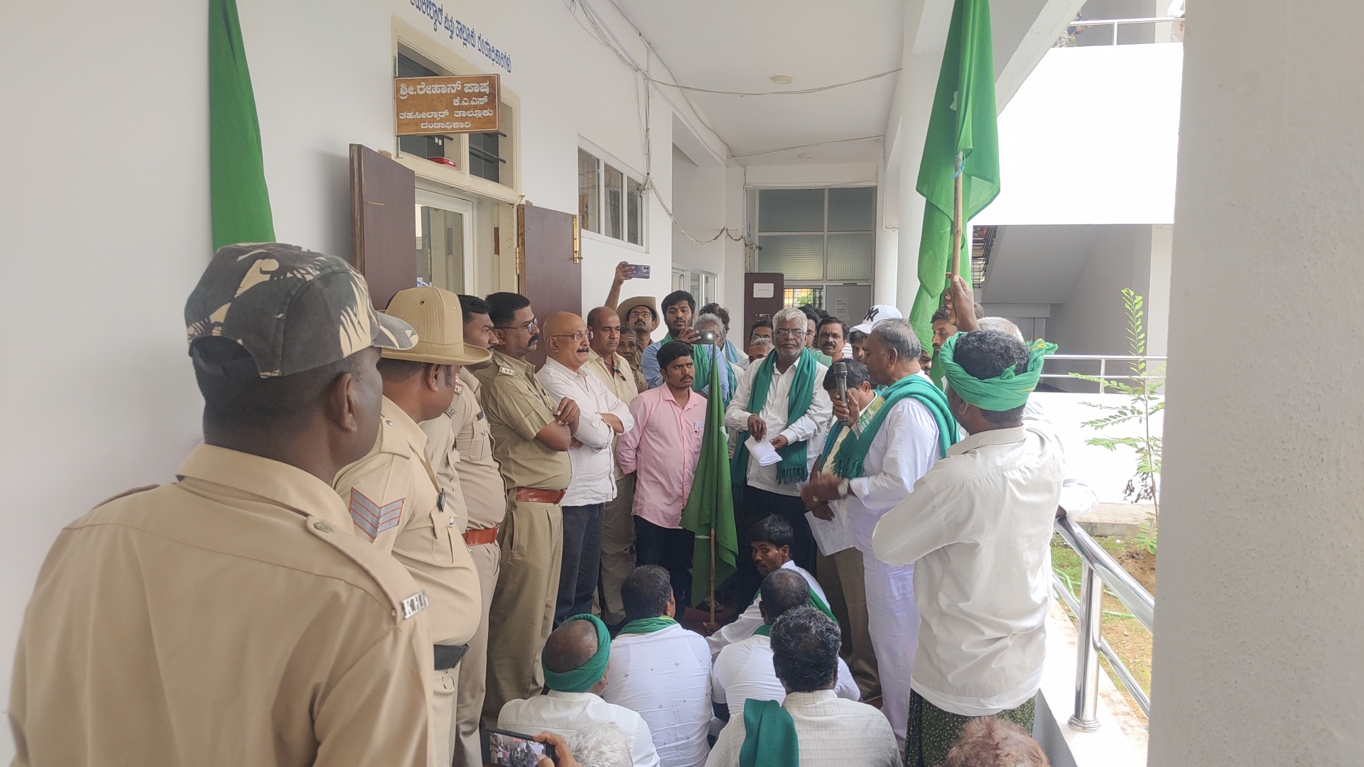 ಪ್ರತಿಭಟನೆ ಸ್ಥಳಕ್ಕೆ ದಾವಿಸಿಲ್ಲ ಎಂದು ತಹಶಿಲ್ದಾರ್ ಕಛೇರಿಯ ಬಾಗಿಲಿಗೆ ಅಡ್ಡವಾಗಿ ಕುಳಿತು ಪ್ರತಿಭಟನೆ. :