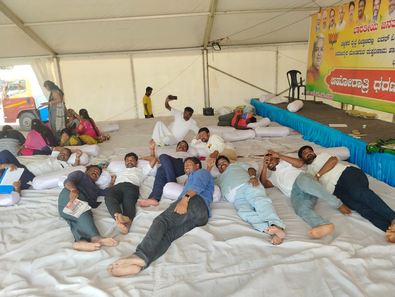 ಇನ್ನೂ ಮೂರು ದಿನಗಳಿಂದ ಸತತವಾಗಿ ಮಳೆ ಗಾಳಿ ಲೆಕ್ಕಿಸದೆ ಧರಣಿ ಮಾಡುವ ಬಿಜೆಪಿ ಕಾರ್ಯಕರ್ತರು ಲಾರಿಯನ್ನು ತಡೆದು ಮೈನಿಂಗ್ ದೂಳು ಬಾರದ ರೀತಿಯಲ್ಲಿ ನೀರು ಹಾಕಿ ತಾಟಪಲ್ ಹಾಕಿಕೊಂಡು ಹೋಗಿ ಎಂದು ಕೆಲ ಕಾಲ ಲಾರಿಯನ್ನು ತಡೆದ ಪ್ರಸಂಗ ಜರುಗಿದೆ.
