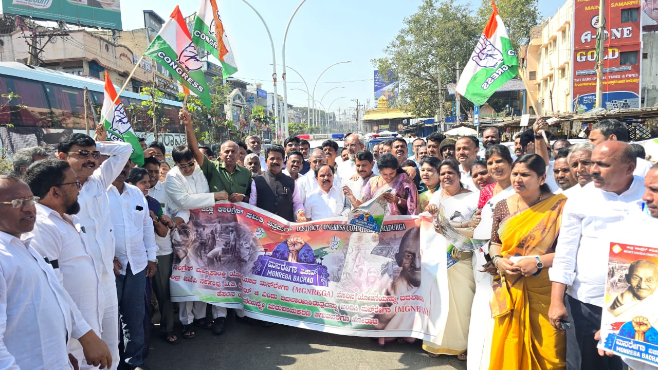 ಚಿತ್ರದುರ್ಗ ಜಿಲ್ಲಾ ಕಾಂಗ್ರೇಸ್ ಸಮಿತಿ ವತಿಯಿಂದ ಚಿತ್ರದುರ್ಗ ನಗರದಲ್ಲಿ ನಡೆದ ಕಾಂಗ್ರೆಸ್ ಮಹತ್ವಾಕಾಂಕ್ಷಿ ಯೋಜನೆಯಾದ ಮನರೇಗಾ ಹೆಸರಿನ ಯೋಜನೆಯನ್ನು ಬದಲಾಯಿಸಿ ಕೇಂದ್ರ ಬಿಜೆಪಿ ಸರ್ಕಾರವು ವಿಬಿ ರಾಮ್ ಜೀ ಎಂದು ಬದಲಾಯಿಸುವುದನ್ನು ಖಂಡಿಸಿ ಮನರೇಗಾ ಹೆಸರಿನ ಯೋಜನೆಯನ್ನು ಮರುನಾಮಕರಣ ಮಾಡುವಂತೆ ನಡೆದ ಪ್ರತಿಭಟನೆ, 5 ಕಿ.ಮೀ. ಪಾದಯಾತ್ರೆ ಮತ್ತು ಉಪವಾಸ ಸತ್ಯಾಗ್ರಹದ ಕಾರ್ಯಕ್ರಮದಲ್ಲಿ ಜಿಲ್ಲಾ ಉಸ್ತುವಾರಿ ಮಂತ್ರಿ ಡಿ.ಸುಧಾಕರ್,