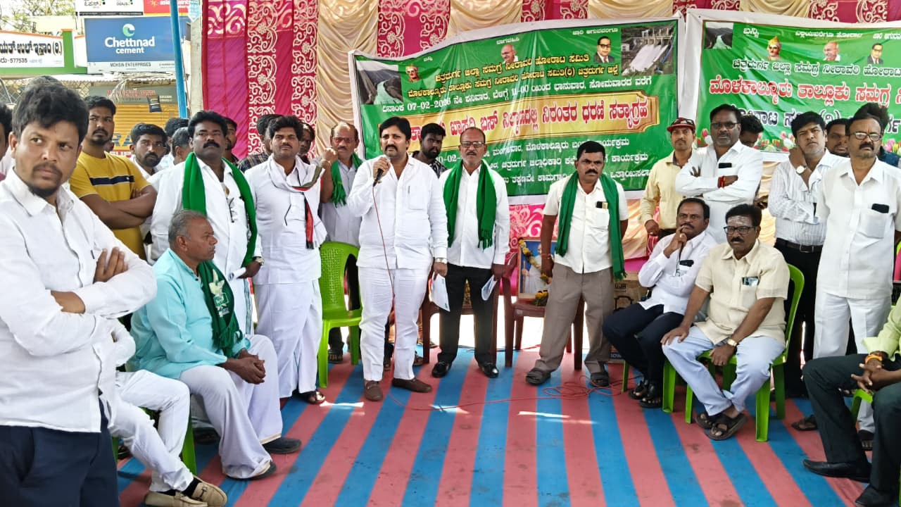 ಮೊಳಕಾಲ್ಮೂರು : ಪಟ್ಟಣದ ಖಾಸಗಿ ಬಸ್ಟಾಂಡ್ ಮುಂಭಾಗದಲ್ಲಿ ಭದ್ರಾ ಮೇಲ್ದಂಡೆ ಯೋಜನೆಯಲ್ಲಿ ತಾಲ್ಲೂಕಿನ ಎಲ್ಲಾ ಕೆರೆಗಳಿಗೆ ನೀರು ತುಂಬಿಸುವ ಯೋಜನೆಯು ನೆನೆಗುದಿಗೆ ಬಿದ್ದಿರುವ ಪರಿಣಾಮವಾಗಿ ತಾಲ್ಲೂಕು ಖಾಸಗಿ ಸಮಗ್ರ ನೀರಾವರಿ ಹೋರಾಟ ಸಮಿತಿಯು ಪ್ರತಿಭಟನೆ ಮಾಡುವುದರ ಮೂಲಕ ಧರಣಿ ಸತ್ಯಾಗ್ರಹ ಮಾಡಿದರು.